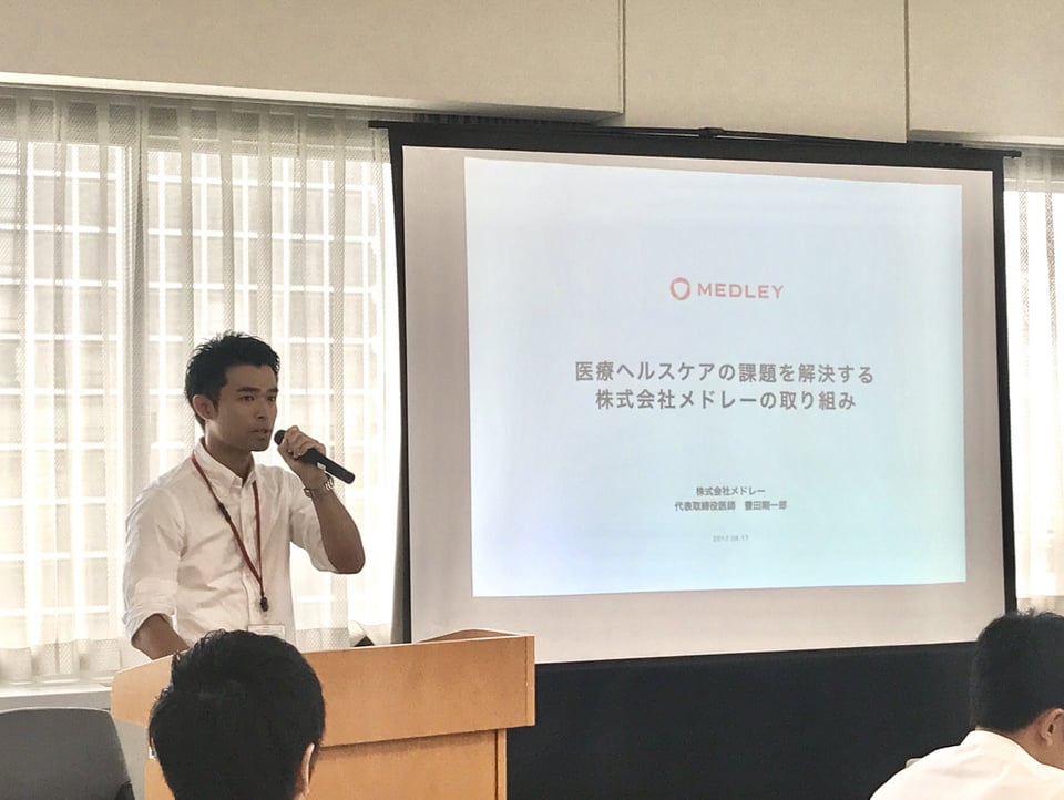プログラムは、医療ヘルスケア業界を変革するベンチャー企業の現場を知るというものです。まずは代表取締役医師・豊田が企業概要や経済産業省と連携した実際の取り組みについて講演した後、メドレーのオフィスを見学してもらいました。オフィスでは、法務、財務、広報・採用の担当者がそれぞれの業務を紹介したほか、業界の変革に向けた国との連携の必要性などをお話しました。