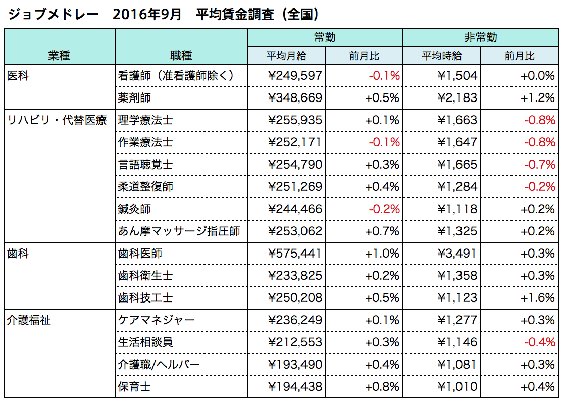 NewsRelease_医療介護の求人サイト「ジョブメドレー」 、2016年9月 医療介護15職種の平均月給・時給調査を発表_20161031