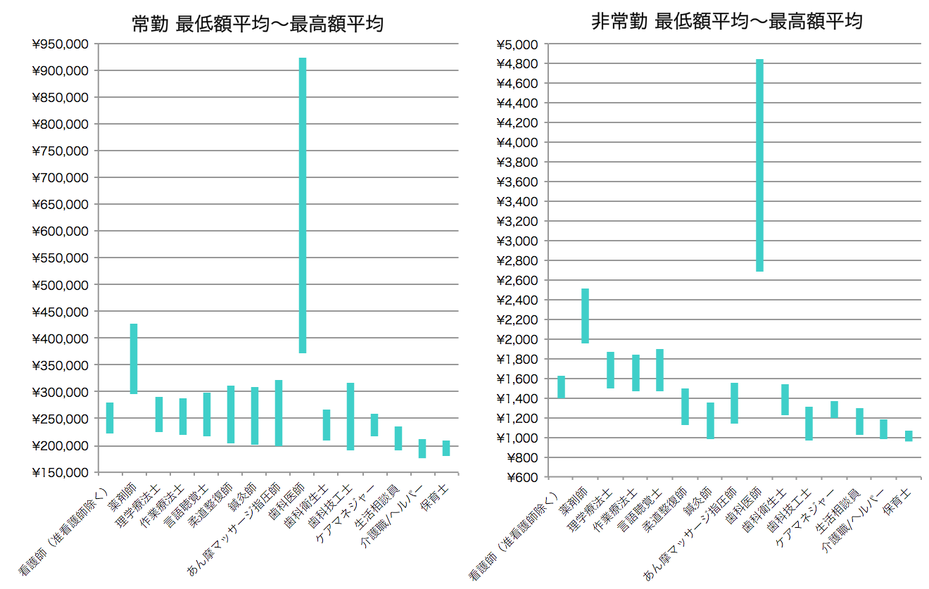 職種別にみると、上位は「歯科医師」が月給57.5万円・時給3,491円、「薬剤師」が月給34.9万円・時給2,183円、「理学療法士」が月給25.6万円・時給1,663円となりました。