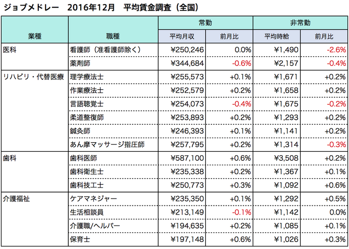 NewsRelease_ジョブメドレー、2016年12月 医療介護15職種の平均月給・時給調査を発表_20170131