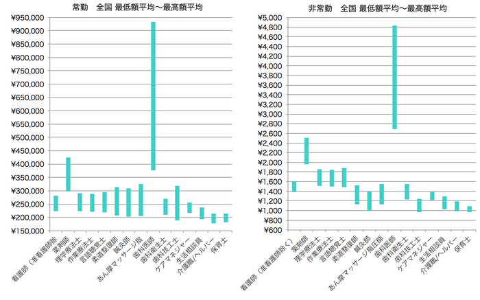 「柔道整復師」「鍼灸師」「あん摩マッサージ指圧師」の代替医療系職種および「理学療法士」「作業療法士」の常勤は、最低額平均と最高額平均の差が拡大傾向にあります。もともとこれらの職種は訪問リハビリ・訪問マッサージのニーズが高く、一人で訪問して業務をできる経験者の採用を強化している職種です。そのなかで4月にむけた新卒採用が開始したことで、給与レンジに幅が出たと考えられます。