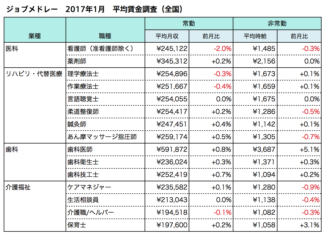 医療介護の求人サイト「ジョブメドレー」 2017年1月 医療介護15職種の平均月給・時給調査を発表 賃金プラス傾向続く保育士は、潜在有資格者の再就職促進の動きも進む