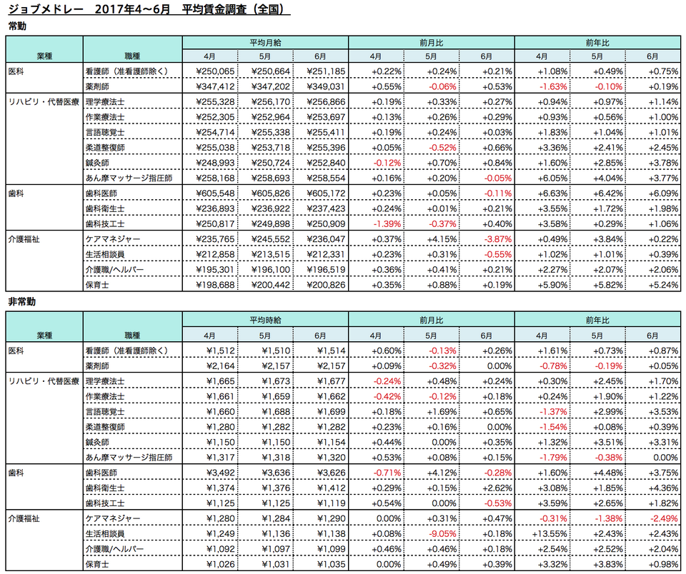 医療介護の求人サイト「ジョブメドレー」、2017年4〜6月 医療介護15職種の平均月給・時給調査を発表 〜常勤では14職種で3ヶ月連続前年比プラス 人手不足による賃金上昇が続く〜