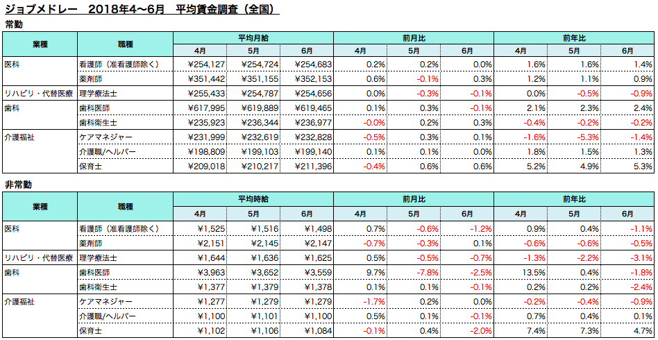 2018年4〜6月 医療介護8職種の平均月給・時給を発表 - 新卒採用がひと段落も、採用意欲の高い状況が続く