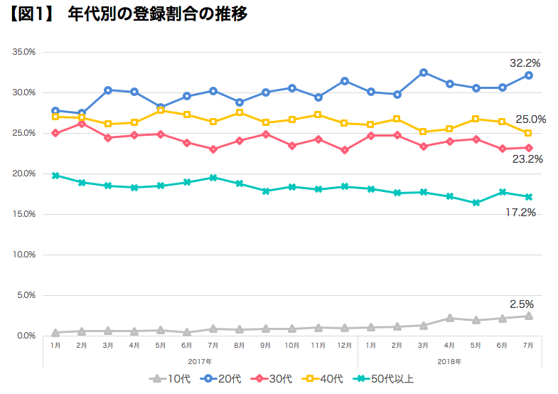 年代別にみると、2018年7月時点で、もっとも登録者の割合が高いのは20代の32.2%で、次いで40代(25.0%)、30代(23.2%)、50代以上(17.2%)、10代(2.5%)となっています。20代の登録者の割合は2017年に入ってから増加を続けており、2018年は全体の3割を超える月が続いています。