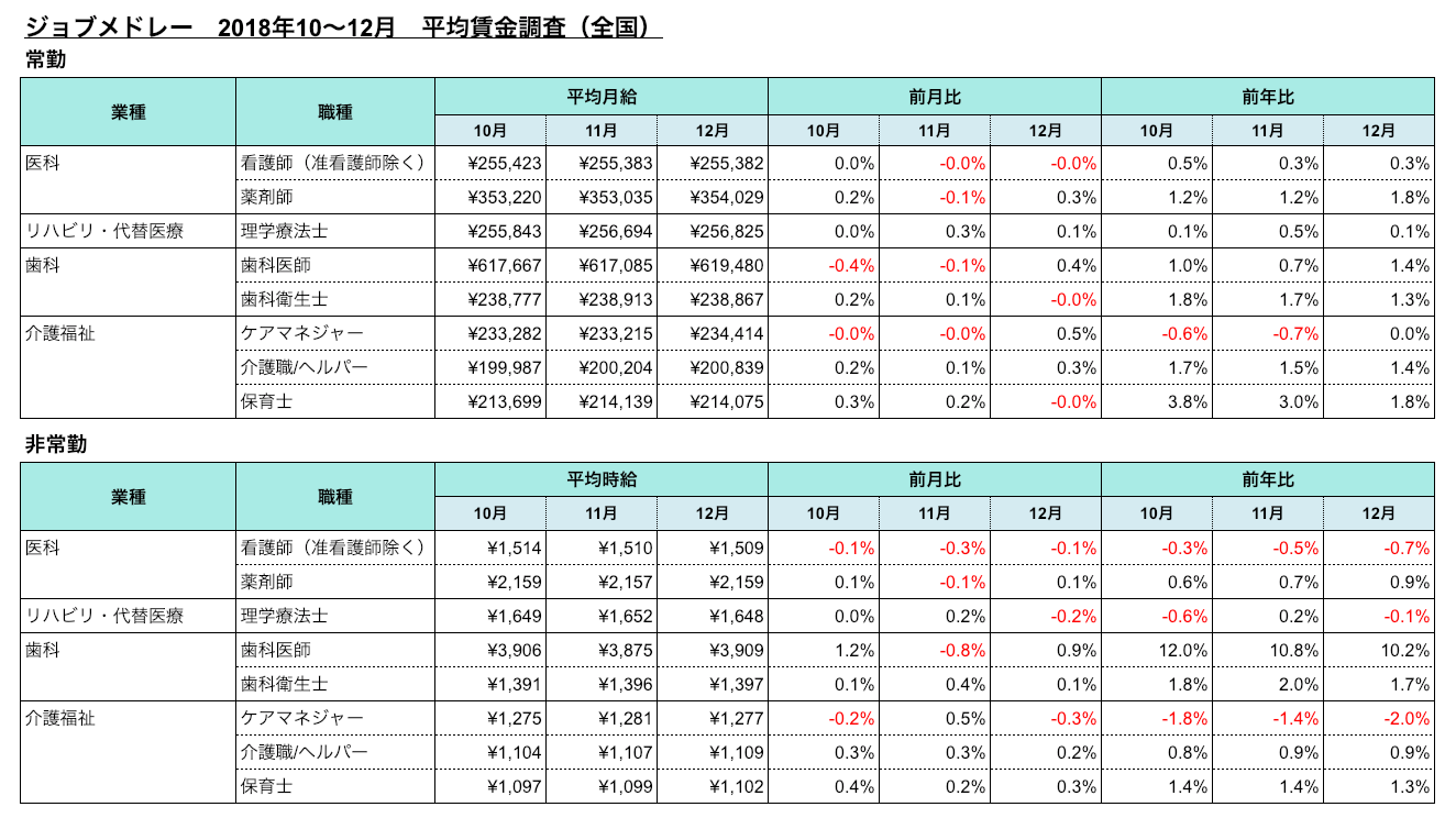 株式会社メドレー(本社:東京都港区、代表取締役医師:豊田 剛一郎、代表取締役社長:瀧口 浩平)が運営する医療介護求人サイト「ジョブメドレー」は、医療介護系8職種について、2018年10〜12月の平均月給・時給をまとめました。