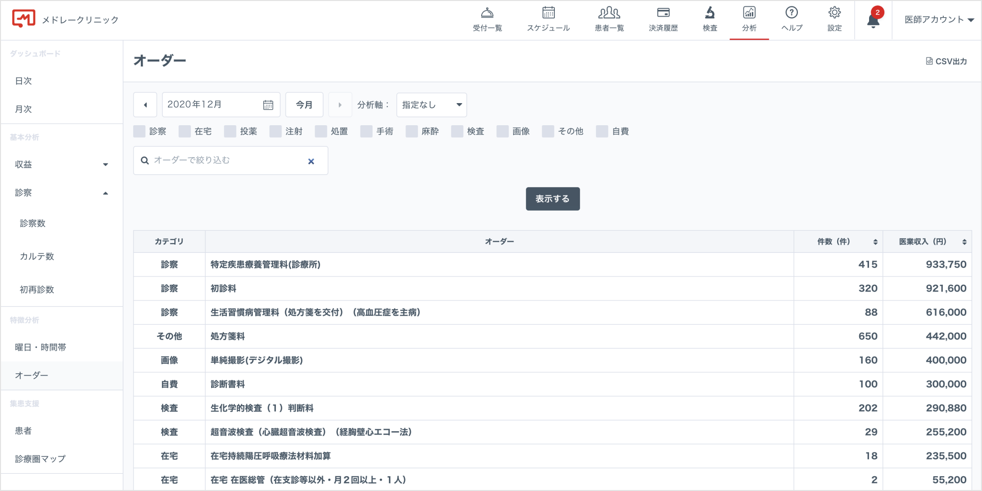 「曜日・時間帯」と「オーダー」に分かれています。「曜日・時間帯」では、指定した期間の診察数を曜日・時間帯ごとにグラフおよび表で表示することで、患者の来院タイミングの分析ができます。「オーダー」は、診療行為コードから実施した診療行為ごとの件数と医業収入を抽出し、自院の実施している診療行為の傾向を一覧で把握することができます。