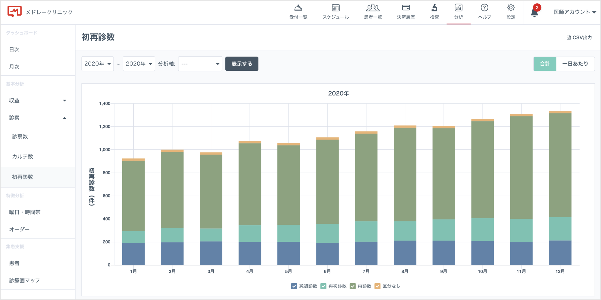 ※「経営分析機能」では、CLINICSカルテで入力された情報のみを集計対象としています。CLINICSカルテのご利用開始にあたって他社電子カルテ、レセコンからのデータ移行を実施している場合、移行データは集計対象外となっています。