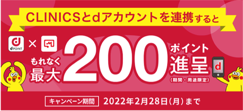 また、今回の共同運営化を記念して、「『CLINICS』 dポイントプレゼントキャンペーン」を実施いたします。キャンペーン期間中に「CLINICS」と「dアカウント」の連携などの条件を達成いただくことで、最大200ポイントのdポイント(期間・用途限定)をプレゼントいたします。
