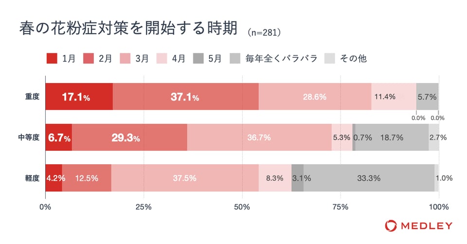 春の花粉症対策は何月から始めるか尋ねたところ、重度の方の半数以上が1〜2月から開始しており、重症度が高いほど対策開始時期が早いことがわかりました(n=281)。