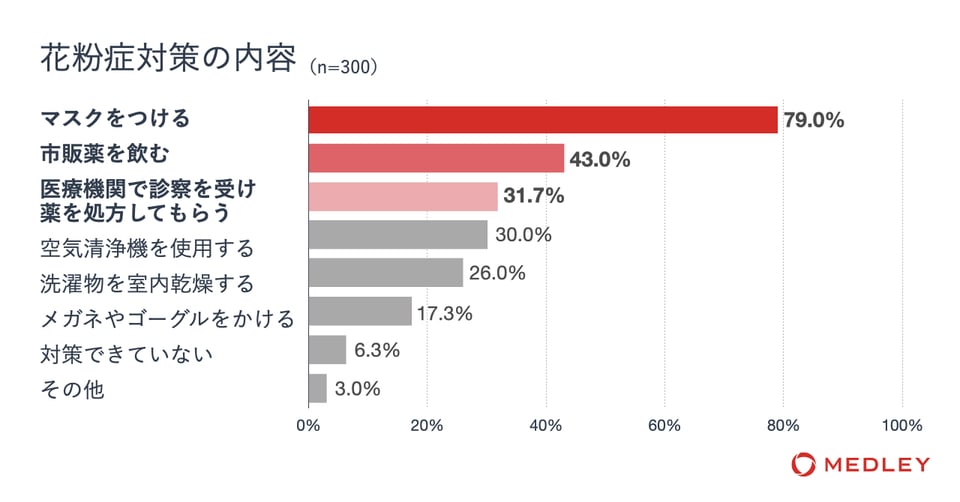 どのような花粉症対策をしているかを尋ねたところ、「マスクをつけている」が最も多く、「市販薬を飲む」「医療機関で診察を受け処方してもらう」が続きました。特に処方薬の利用は重症になるほど割合が高い傾向がありました(n=300)。