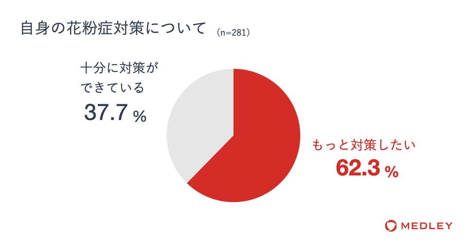 自身の花粉症対策についてどう思っているかを尋ねたところ、「もっと対策したい」と回答した方が62.2%で、6割以上の方が自身の花粉症対策に満足していないことがわかりました(n=281)。