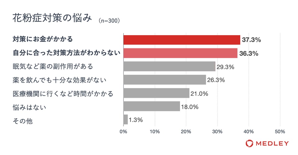 花粉症対策の悩みを尋ねたところ、「対策にお金がかかる」が37.3%で最も多く、「自分に合った対策方法がわからない」が36.3%と続きました(n=300)。