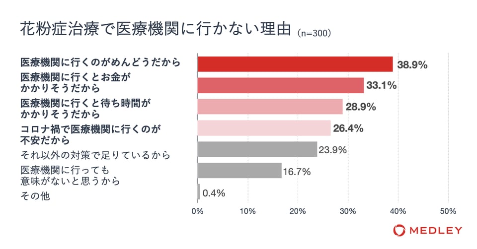 花粉症治療で医療機関に行かない理由を尋ねたところ、「医療機関に行くのがめんどうだから」「医療機関に行くとお金がかかりそうだから」「医療機関に行くと待ち時間がかかりそうだから」という受診の負担に関する回答が上位を占め、「コロナ禍で医療機関に行くのが不安だから」という回答が続きました(n=300)。