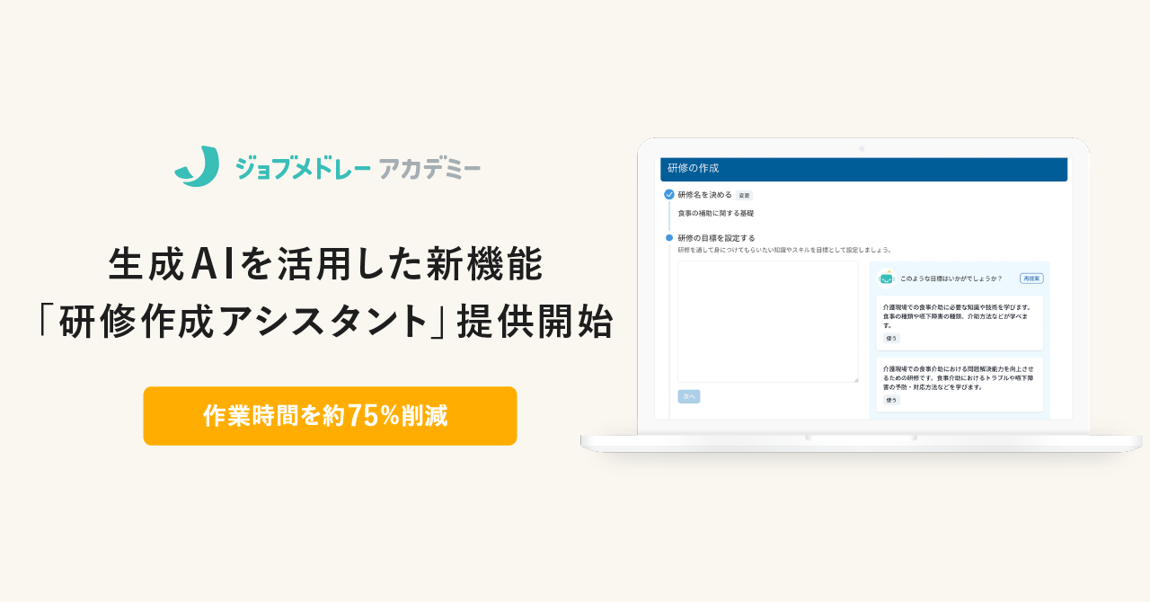 メドレー、介護・障がい福祉事業所向けオンライン動画研修サービス「ジョブメドレーアカデミー」で生成AIを活用した新機能「研修作成アシスタント」提供開始 〜研修作成業務を効率化し、作業時間を約75%削減〜