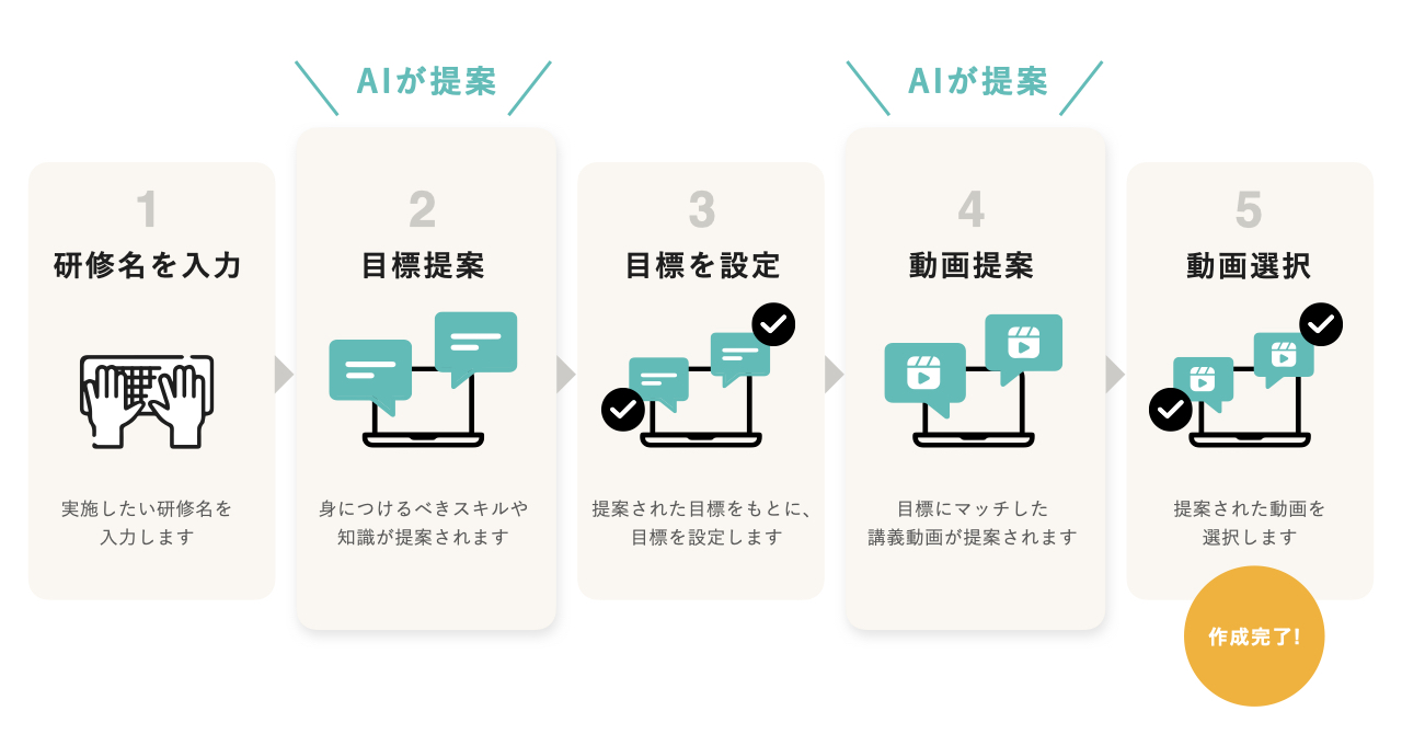 研修担当者が研修を作成する際、研修名と研修の目標を入力するだけでおすすめの講義動画が提案される機能です。研修担当者の操作の流れは以下の通りです。