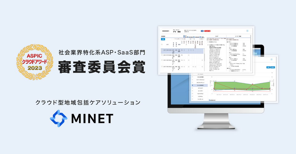 株式会社メドレーのグループ会社である株式会社パシフィックメディカル(代表取締役:小松 広行、以下「パシフィックメディカル」)が提供する、クラウド型地域包括ケアソリューション「MINET(ミネット)」が第17回「ASPICクラウドアワード2023」にて審査委員会が推薦する優れたサービスであるとして「社会業界特化系ASP・SaaS部門 審査委員会賞」を受賞しました。