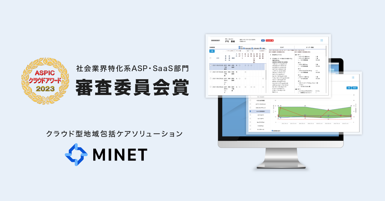 【グループ会社】クラウド型地域包括ケアソリューション「MINET」、総務省後援「ASPIC クラウドアワード2023」において「社会業界特化系ASP・SaaS部門 審査委員会賞」を受賞