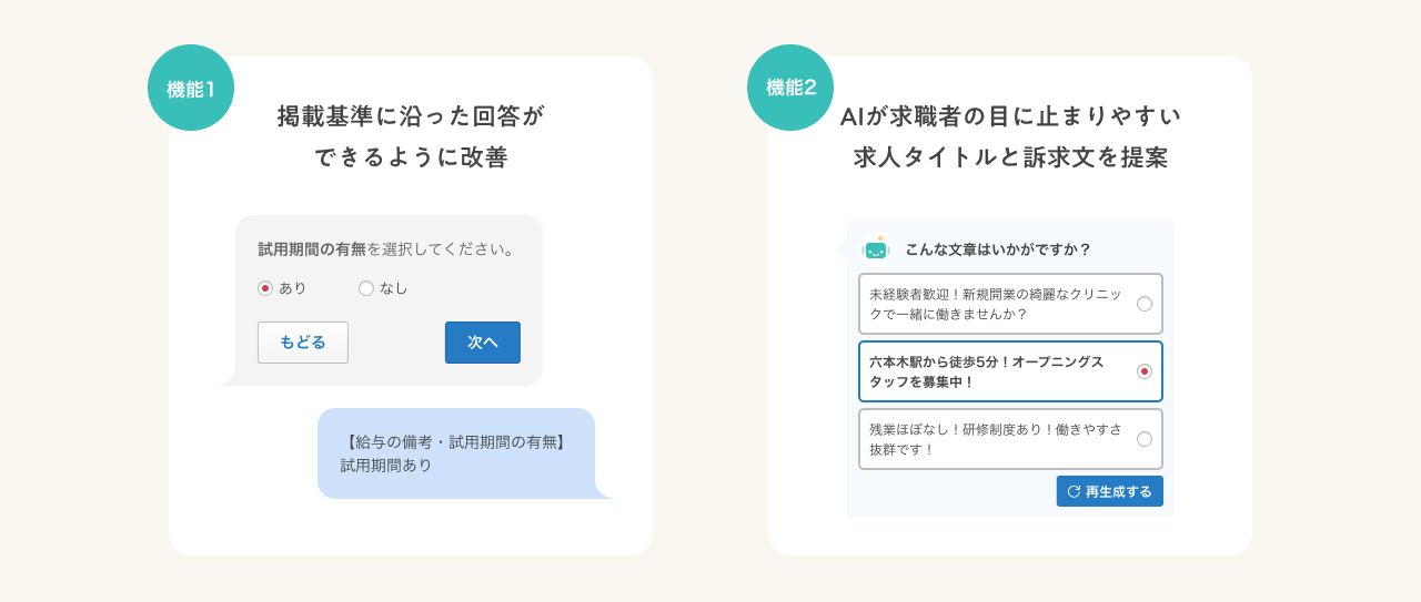 これまでのフォーム入力形式や既存の求人原稿を参考にした作成方法に加え、質問に回答する形式と生成AIを組み合わせた原稿作成補助機能を追加しました。