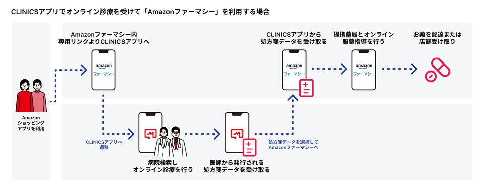 今回、「Amazonファーマシー」と「CLINICS」が連携することで、「Amazonファーマシー」の利用者は「CLINICS」アプリを通じてオンライン診療を受け、「Amazonファーマシー」を利用することが可能になります。