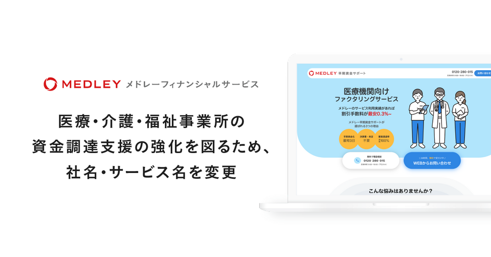 【グループ会社】メドレーフィナンシャルサービス、医療・介護・福祉事業所の資金調達支援の強化を図るため、社名・サービス名を変更して メドレーグループとしてブランド統一〜ファクタリングサービス「メドレー早期資金サポート」を、 メドレーサービス利用者に向けてさらに低手数料で提供開始〜