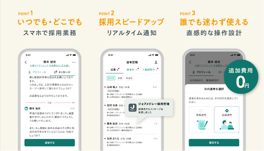 シンプルに操作できるUI設計により、採用業務の経験が浅くても直感的にご利用いただけます。「ジョブメドレー」掲載事業者であれば、アプリをダウンロードするだけで追加費用なく利用を開始でき、導入の手間もかかりません。