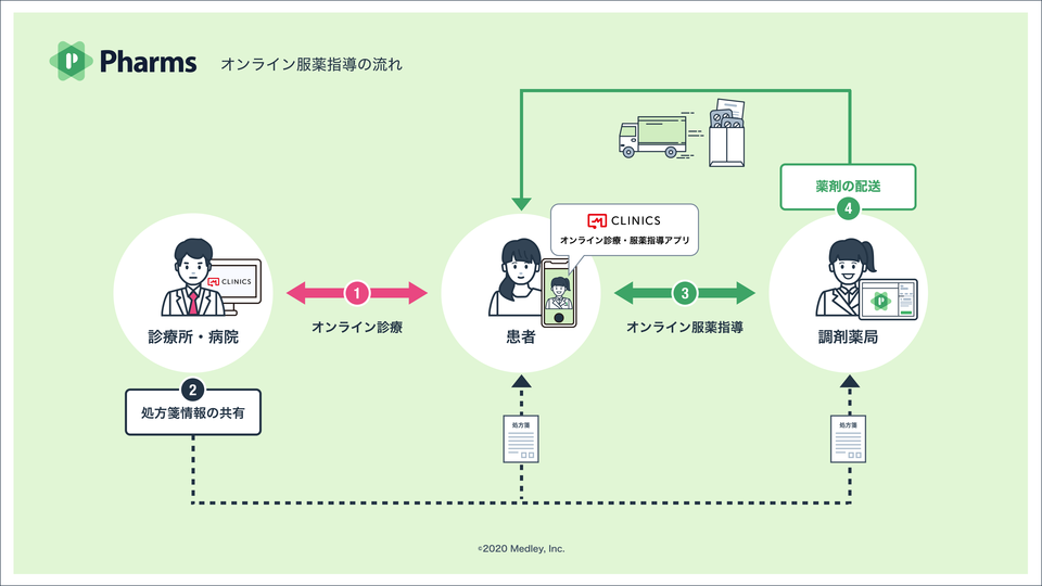 メドレーが開発・運営を行う「Pharms」は新しい患者体験と業務効率の向上を目指した調剤薬局向けシステムです。患者はオンライン診療・服薬指導アプリ「CLINICS(クリニクス)」をダウンロードすることで、診療所・病院でのオンライン診療から調剤薬局でのオンライン服薬指導までを利用することがきます。忙しいビジネスパーソンや子育て中の方、体が不自由な方の負担軽減に繋がるだけではなく、医療機関内での感染防止にも繋がるものです。